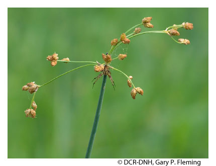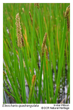 Vegetation of high-energy tidal shores varies from sparse to dense, but tends to be low-statured (< 1 m tall, often much less). Unlike most marshes, these communities occur in linear patches, chiefly < 10 m wide, and most occur under both freshwater and oligohaline regimes. Composition appears to vary with substrate and other environmental dynamics. Species of bulrush, particularly common threesquare (Schoenoplectus pungens var. pungens) and soft-stem bulrush (Schoenoplectus tabernaemontani), are characteristic of most sites. Common threesquare dominates gravelly shores of the tidal Potomac River in northern Virginia, where ice scouring is most frequent. Vegetation of sandy habitats subject to greater periodic turbulence tends to be sparse and contain low annuals and perennials such as shore quillwort (Isoetes riparia), Parker's pipewort (Eriocaulon parkeri), dotted smartweed (Persicaria punctata), dwarf arrowhead (Sagittaria subulata), grass-leaved arrowhead (Sagittaria graminea), American waterwort (Elatine americana), flatsedges (Cyperus spp.), common water-purslane (Ludwigia palustris), and golden club (Orontium aquaticum). Common water-willow (Justicia americana) often forms dominance patches on clayey mudflats and bars. Vegetation of mucky channel edges is usually taller and contains common threesquare, soft-stem bulrush, and square-stem spikerush (Eleocharis quadrangulata), along with pickerelweed (Pontederia cordata var. cordata), arrow-arum (Peltandra virginica), wild rice (Zizania aquatica var. aquatica), tidal-marsh amaranth (Amaranthus cannabinus), swamp barnyard grass (Echinochloa walteri), and other more typical marsh species.