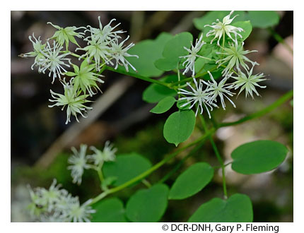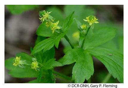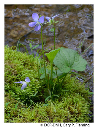 Along montane floodplains, most of the lower, streamside terraces are probably flooded briefly at least annually. More powerful, catastrophic floods occur at irregular intervals and may be very destructive to stream channels and vegetation. The forests of these habitats are characterized by a mixture of bottomland and mesophytic species. Among the most common trees are sycamore (Platanus occidentalis), eastern hemlock (Tsuga canadensis), eastern white pine (Pinus strobus), white oak (Quercus alba), birches (Betula alleghaniensis and Betula lenta var. lenta), and tulip-tree (Liriodendron tulipifera). Other trees that may be locally important are American beech (Fagus grandifolia), yellow buckeye (Aesculus flava), red maple (Acer rubrum), American elm (Ulmus americana) and, in far southwestern Virginia only, sweetgum (Liquidambar styraciflua). Understory shrubs may include American hornbeam (Carpinus caroliniana), great rhododendron (Rhododendron maximum), smooth alder (Alnus serrulata), willows (Salix sericea and Salix nigra), and witch hazel (Hamamelis virginiana var. virginiana). Montane floodplain habitats are relatively well drained and support a great variety of mostly mesophytic herbaceous species such as hog-peanut (Amphicarpaea bracteata), common jack-in-the-pulpit (Arisaema triphyllum ssp. triphyllum), green-and-gold (Chrysogonum virginianum var. virginianum), and golden ragwort (Packera aurea). More frequently flooded and hydric microhabitats along the stream channels, however, usually support some wetland species, e.g., twisted sedge (Carex torta), nodding sedge (Carex gynandra), fowl mannagrass (Glyceria striata var. striata), hooked buttercup (Ranunculus recurvatus var. recurvatus), and marsh blue violet (Viola cucullata).