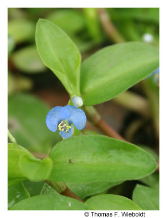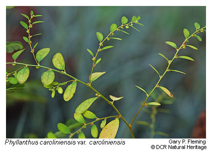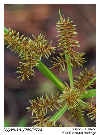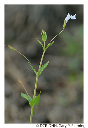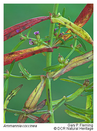 Species of relatively wide distribution on sandy or gravelly draw-down shores include creeping dayflower (Commelina diffusa), red-root flatsedge (Cyperus erythrorhizos), creeping lovegrass (Eragrostis hypnoides), halberd-leaf rose-mallow (Hibiscus laevis), small-flower halfchaff sedge (Cyperus subsquarrosus), common water-willow (Justicia americana), low spikesedge (Cyperus hortensis), false pimpernels (Lindernia dubia var. dubia and var. anagallidea), seedboxes (Ludwigia spp.), spreading panic grass (Panicum dichotomiflorum var. dichotomiflorum), water paspalum (Paspalum fluitans), marsh yellow cress (Rorippa palustris ssp. palustris ), and toothcup (Rotala ramosior). Species characteristic of Piedmont and mountain draw-down shores include scarlet ammannia (Ammannia coccinea), nodding beggar-ticks (Bidens cernua), three-lobe beggar-ticks (Bidens comosa), spreading sandmat (Euphorbia humistrata), awned flatsedge (Cyperus squarrosus), dock-leaf smartweed (Persicaria lapathifolia), and Carolina leaf-flower (Phyllanthus caroliniensis ssp. caroliniensis). Species most typical of Coastal Plain draw-down shores include white-edge flatsedge (Cyperus flavicomus), coastal flatsedge (Cyperus polystachyos), shade mudflower (Micranthemum umbrosum), lax hornpod (Mitreola petiolata), American halfchaff sedge (Cyperus neotropicalis), Bosc's bluets (Oldenlandia boscii), warty panic grass (Kellochloa verrucosa), and coastal rose-pink (Sabatia calycina).