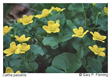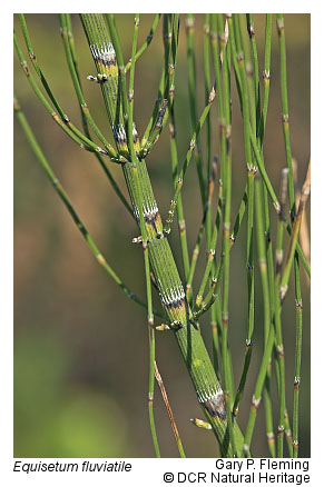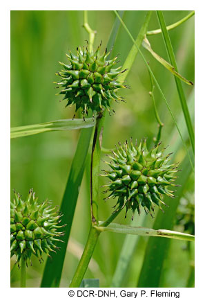 Calcareous Spring Marshes, sometimes referred to as "muck fens," occupy groundwater-flooded sloughs, abandoned meanders, depressions, and spring overflows on large stream or river floodplain terraces. Restricted to a few sites in carbonate rock districts of the Ridge and Valley region, these very rare habitats are highly threatened by impoundments and ditching, grazing, and agricultural pollution. Deep, hydric muck soils have high calcium levels and are more or less permanently saturated or flooded by perched groundwater or seepage inputs. Vegetation is marsh-like and characterized by coarse emergent species: arrow-arum (Peltandra virginica), bur-reeds (Sparganium eurycarpum and Sparganium americanum), water smartweed (Persicaria amphibia), lake-bank sedge (Carex lacustris), hop sedge (Carex lupulina), Virginia cutgrass (Leersia virginica), smooth bur-marigold (Bidens laevis), sweetflag (Acorus calamus), marsh-marigold (Caltha palustris var. palustris), skunk-cabbage (Symplocarpus foetidus), spotted jewelweed (Impatiens capensis), blueflag iris (Iris versicolor), and broad-leaved cattail (Typha latifolia). Buckbean (Menyanthes trifoliata) and water horsetail (Equisetum fluviatile), both very rare species in Virginia, are components at two sites each. A most unusual site in Clarke County consists of a 2 ha (5 ac) marsh developed in the overflow of powerful artesian springs. The marsh here is dominated by broad-leaved cattail and the state-rare, northern disjunct beaked sedge (Carex utriculata), while deep channels support the similarly disjunct flatstem pondweed (Potamogeton zosteriformis).