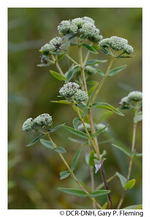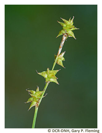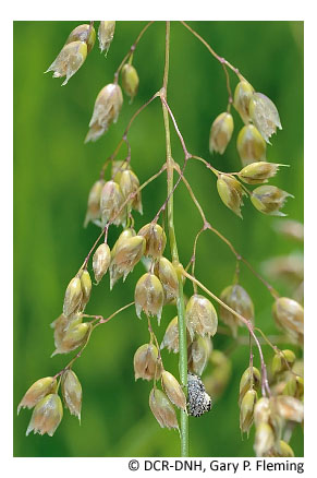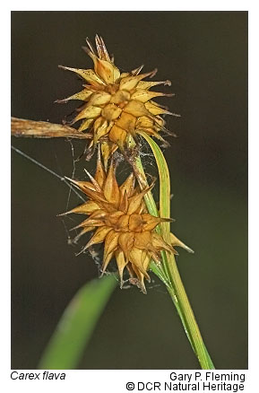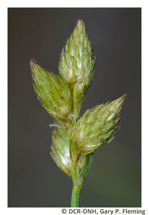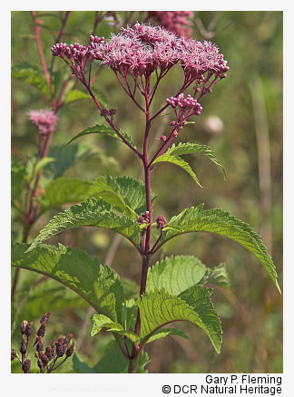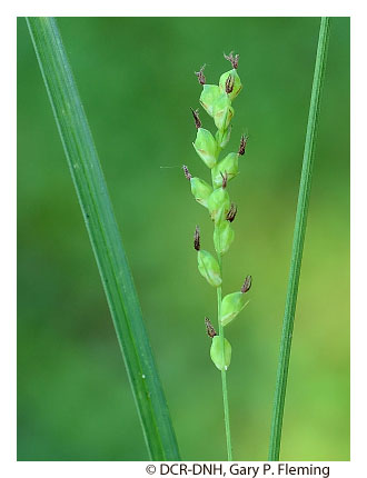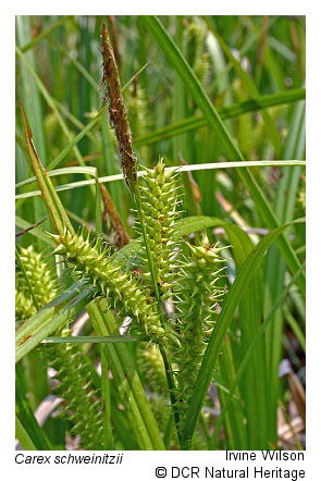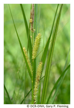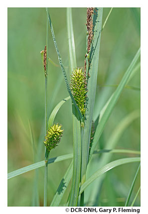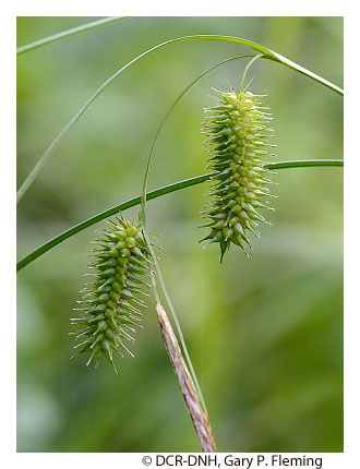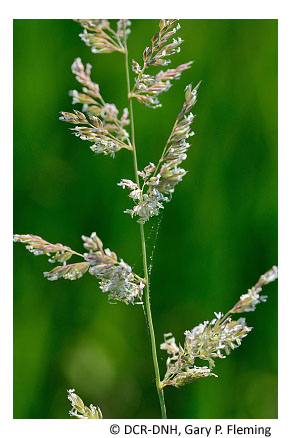 Vegetation of prairie fens is diverse and generally graminoid-dominated; patch-dominance of sedges (e.g., Carex stricta, Carex tetanica, Carex interior, Carex buxbaumii, Carex prairea, Carex suberecta, Carex trichocarpa), baltic rush (Juncus balticus var. littoralis), bald spikerush (Eleocharis erythropoda), common threesquare (Schoenoplectus pungens var. pungens), freshwater cordgrass (Spartina pectinata), switchgrass (Panicum virgatum var. virgatum) and, at a single known Virginia site, holy grass (Hierochloe hirta) is typical. Many low-cover forbs are also components, including several state-rare and unusual species, such as queen-of-the-prairie (Filipendula rubra), prairie loosestrife (Steironema quadriflorum), spotted joe-pye weed (Eutrochium maculatum var. maculatum), northern winged loosestrife (Lythrum alatum), hooded skullcap (Scutellaria galericulata), rough avens (Geum laciniatum), purple fringeless orchid (Platanthera peramoena), and marsh pea (Lathyrus palustris). Reed canary grass (Phalaris arundinacea) is a native perennial grass that frequently becomes invasive in disturbed wet prairies.