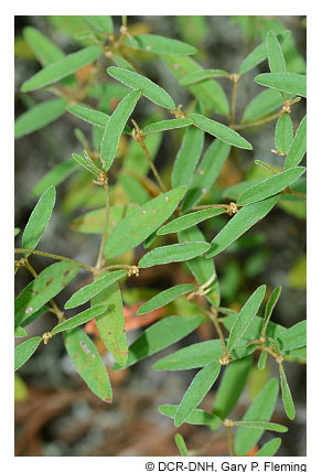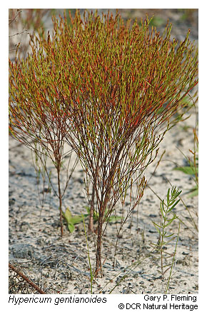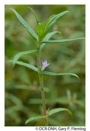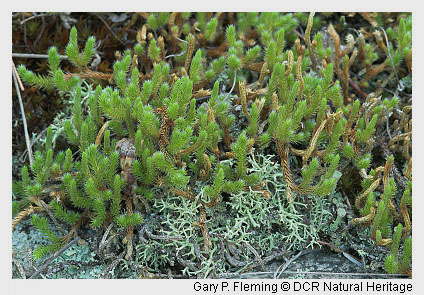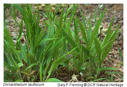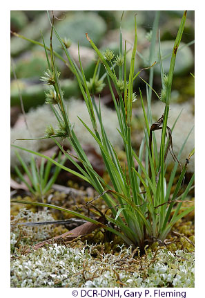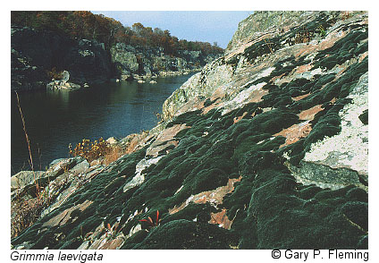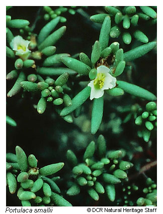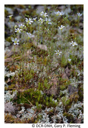 Lichens (e.g., Xanthoparmelia conspersa, Cladonia caroliniana , and other Cladonia spp.) and the bryophyte Grimmia laevigata are dominant biota on granitic flatrocks, covering much of the exposed bedrock. However, vascular plants dominate locally in crevices, flats, and depressions where moisture and thin layers of detritus accumulate. Among the vascular plants, Small's stonecrop (Diamorpha smallii), Small's purslane (Portulaca smallii), and granite flatsedge (Cyperus granitophilus) are globally rare and endemic to these habitats. Other typical vascular plants include roundleaf fameflower (Phemeranthus teretifolius), which typically roots in bryophyte patches; Appalachian sandwort (Minuartia glabra), rock spikemoss (Bryodesma rupestre), common buttonweed (Hexasepalum teres), glade rushfoil (Croton willdenowii), broomsedge (Andropogon virginicus var. virginicus), little bluestem (Schizachyrium scoparium var. scoparium), fork-tip three-awn grass (Aristida dichotoma), purple three-awn grass (Aristida purpurascens), common hair sedge (Bulbostylis capillaris), open-flower panic grass (Dichanthelium laxiflorum), and pineweed (Hypericum gentianoides). These small-patch communities often cover less than 0.4 ha (1 ac) and are considered globally rare. Major threats include invasive non-native weeds, off-road vehicles and quarrying.