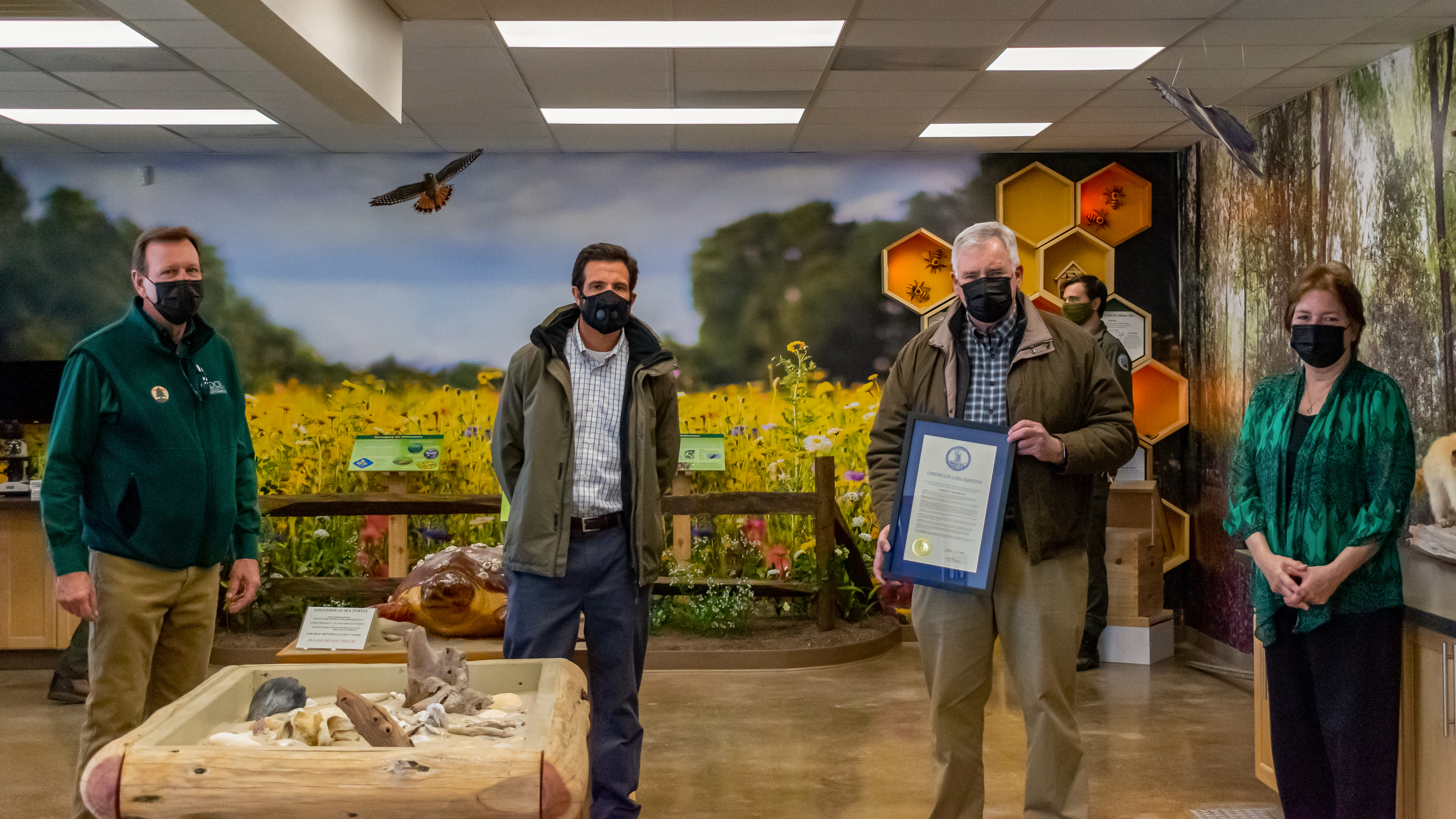 (編輯:點擊此鏈接下載圖像。圖說:從左到右:DCR 主任 Clyde Cristman 和自然資源部長 Matthew J. Strickler 向 Forrest Gladden 及其妻子 Sharon Gladden 頒發了州長 Ralph Northam 頒發的感謝證書。斯蒂芬妮·韋納奇克攝。)