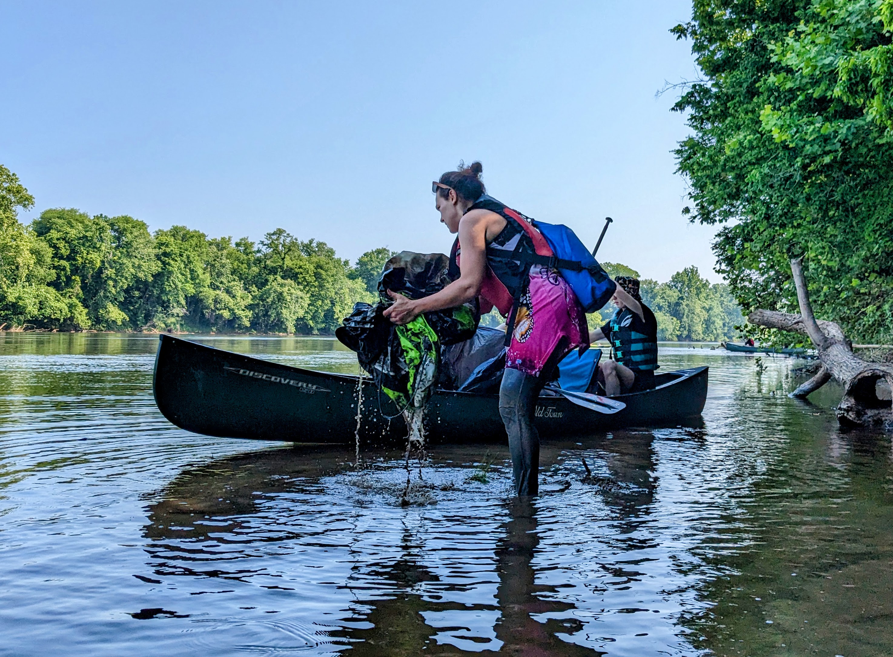 (編輯:點擊此鏈接下載圖像。圖片說明:志願者從波瓦坦州立公園的詹姆斯河搬垃圾)