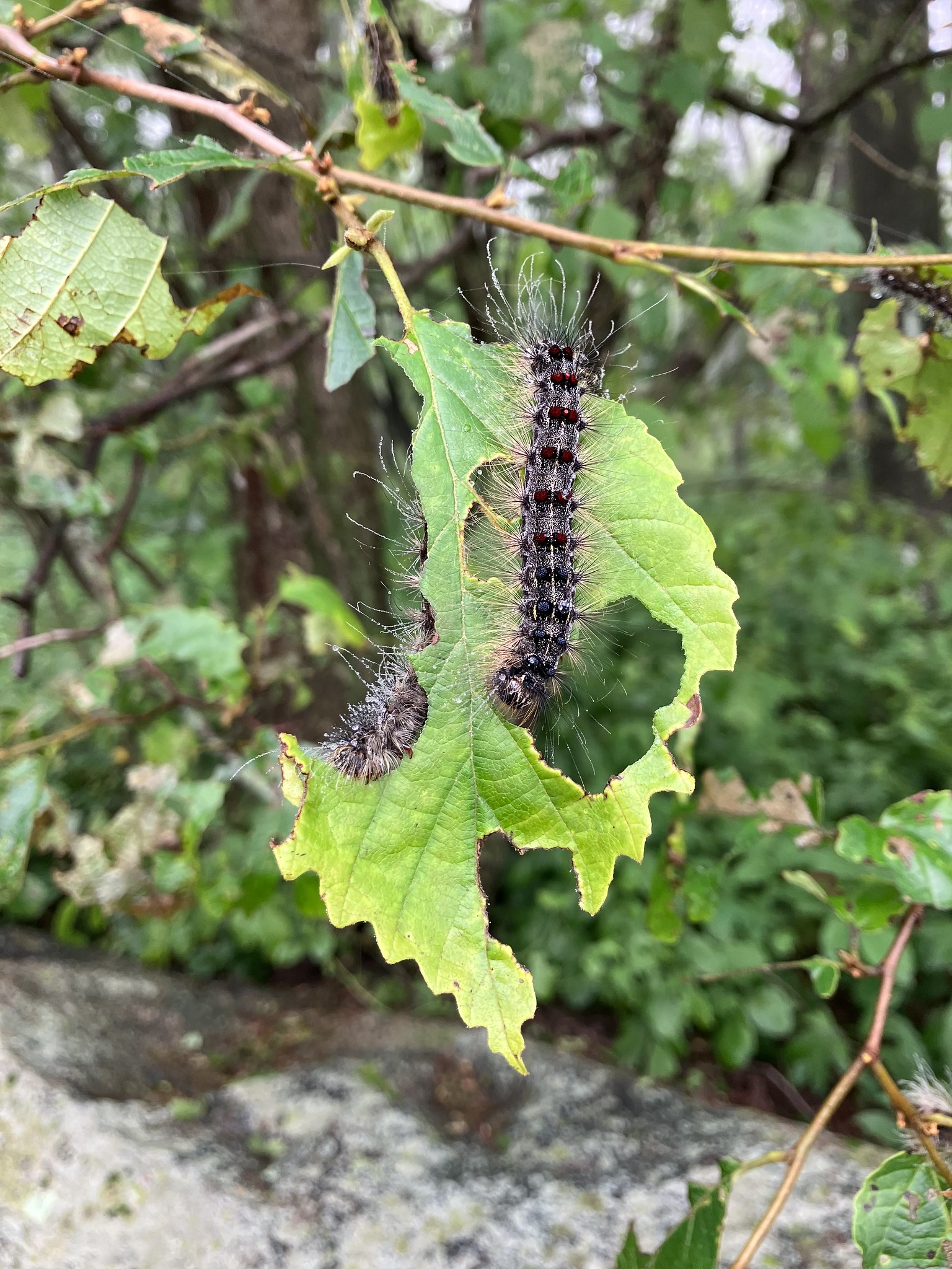 (編輯:點擊此鏈接下載圖像。照片說明:海綿毛毛毛毛毛蟲餵食。毛蟲有五對藍點,接著是六對紅點。需要照片來源:弗吉尼亞 DOF)